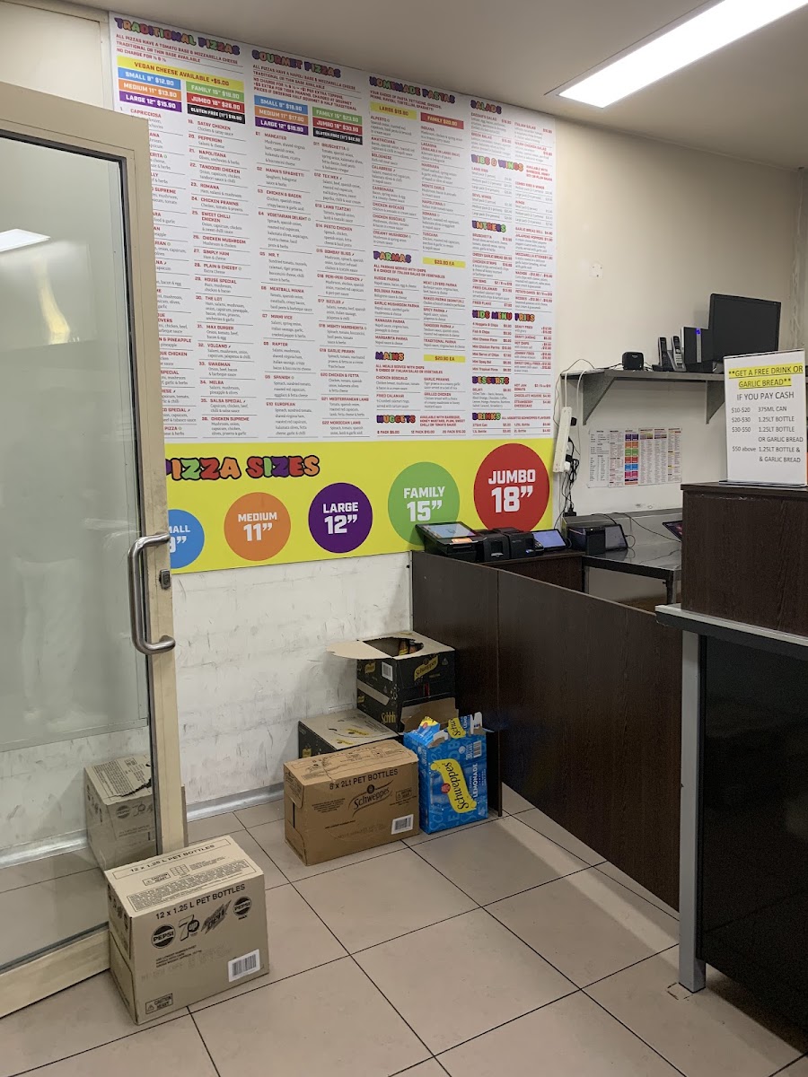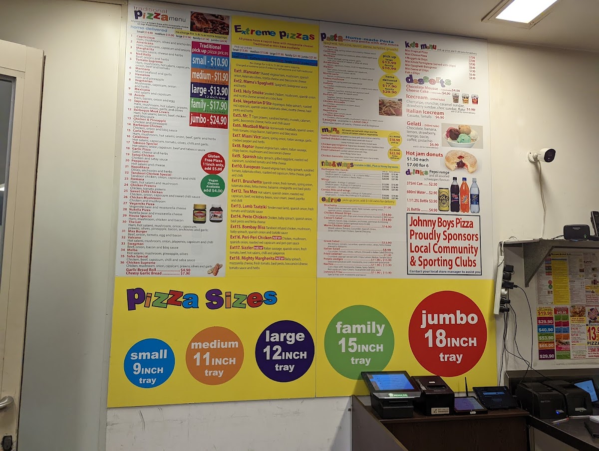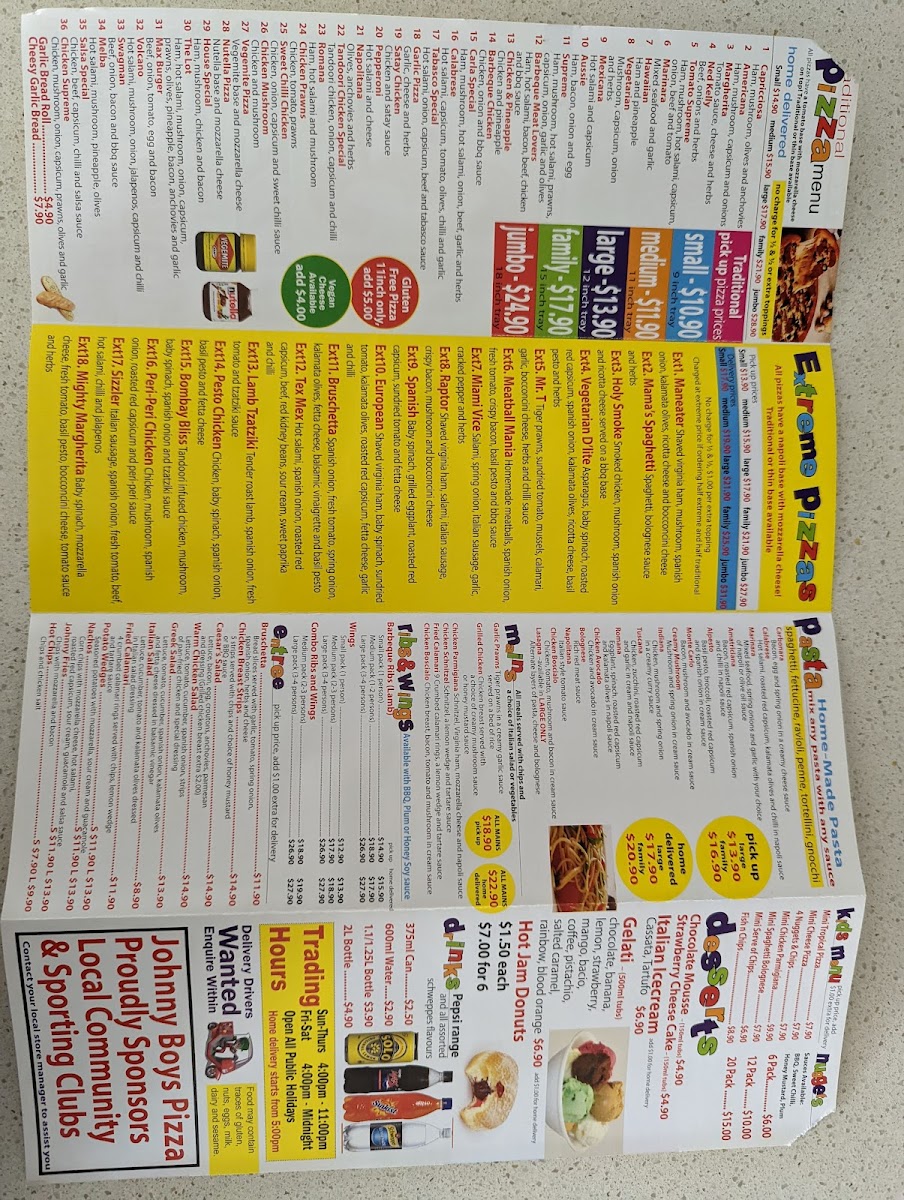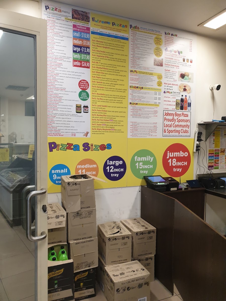 Johnny Boy’s Pizza in Pakenham offers an extensive menu with a variety of delicious options, perfect for all tastes. Their pastas like the Romana and Amatriciana provide a rich Italian experience, while the hearty LasagnaIndiana and Chicken Boscialo bring bold flavors to the table. For dessert lovers, options such as Hot Jam Donuts, Churros, and Chocolate MousseStrawberry Cheesecake will satisfy any sweet tooth. The drinks menu includes a selection of 375ML Cans, 2L Bottles, and 1.1L Bottles for quenching your thirst. When it comes to mains, Fried Calamari, Grilled Chicken, and Garlic Prawns make for a satisfying meal. The Gourmet Pizzas feature standout choices like the Mighty Margherita, Bruschetta, and Tex Mex, while traditional pizza lovers can enjoy classics like the Salsa Special and House Special. Families and larger groups will love the Family Deal, Combo Deal, and Jumbo Deal, offering great value. For sides, Gravy Fries, Big Al's Fries, and Sweet Chili Fries complement the meals perfectly. The kids' menu, including Mini Cheese Pizza and 4 Nuggets & Chips, ensures there’s something for everyone. Johnny Boy’s also offers an array of Parmas, including the Traditional Parma and the unique Tandoori Parma. Appetizers like Mozzarella Sticks and Cheesy Garlic Bread make for great starters, while Wings and Lamb Ribs from the Ribs and Wings section are a must-try for those craving something savory. Salads such as the Greek Salad and Caesar’s Salad provide a refreshing contrast to the heartier options. For those craving a classic, the Fish & Chips selections, including the Family Pack and Dim Sim, are sure to hit the spot. Johnny Boy’s Pizza offers a comprehensive and varied menu that promises to satisfy every craving.